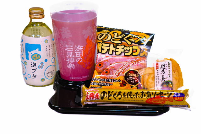 - 環日本海 泡ブタ(アルコール) / のどぐろチップス(小袋)/ のどぐろソーセージ / ドライフルーツ / 石見神楽オリジナルカップ付き